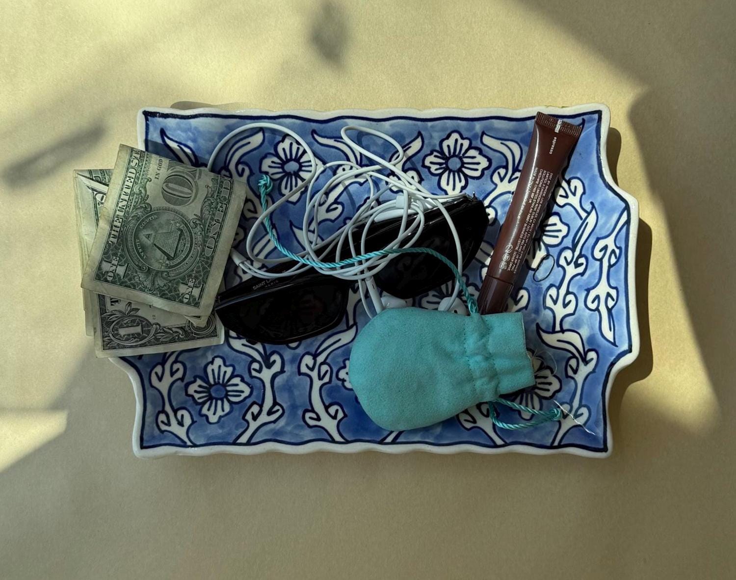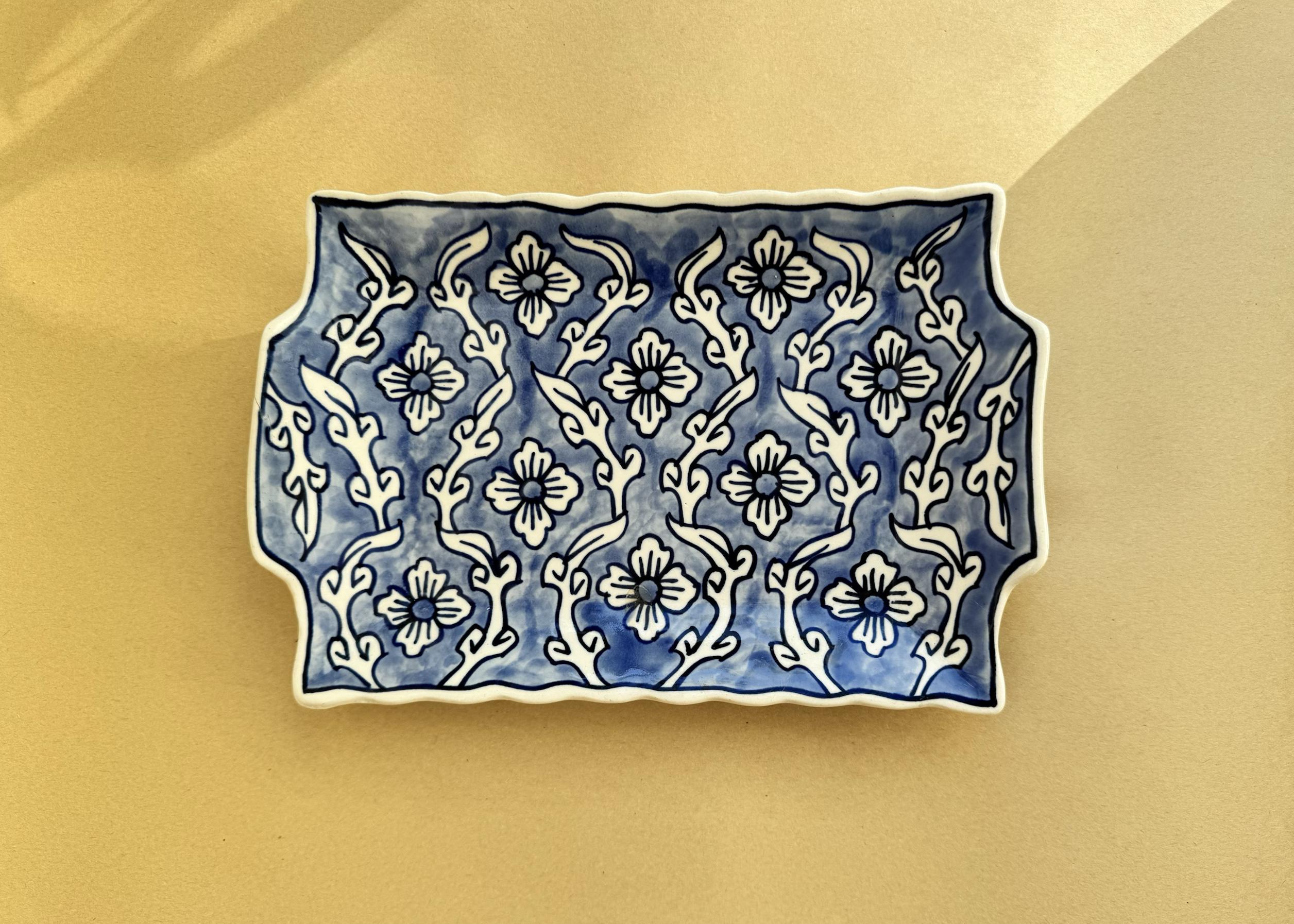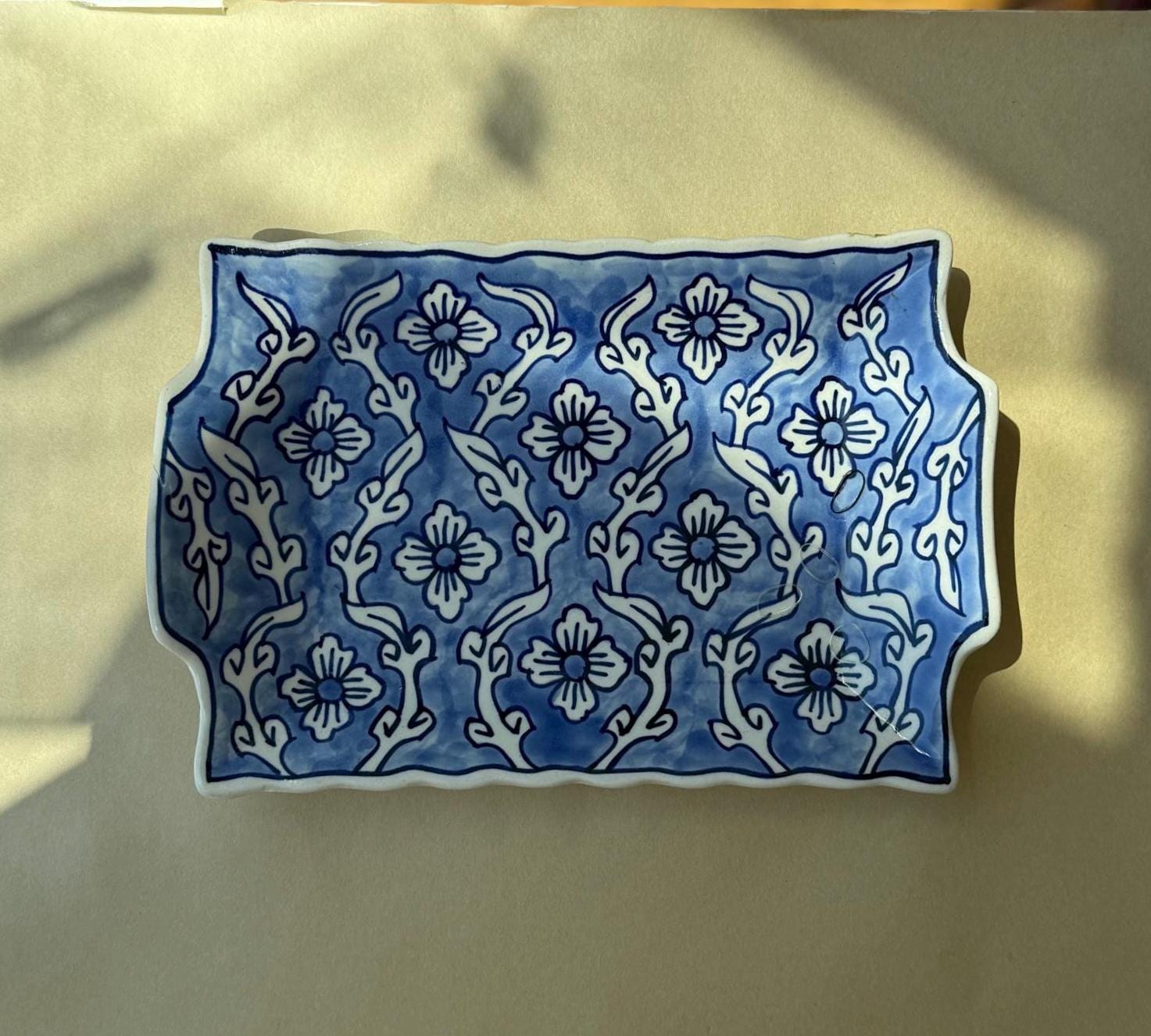 Add timeless elegance to your table with this hand-painted ceramic platter. Featuring a deep, rich blue background adorned with an intricate white and dark blue floral pattern, this rectangular tray is perfect for serving appetizers, desserts, or as a statement decor piece. The slightly irregular shape and scalloped edges enhance its artisanal charm, making each piece truly unique. Whether you're hosting a gathering or looking for a one-of-a-kind gift, this handcrafted platter is a stunning addition to any collection.