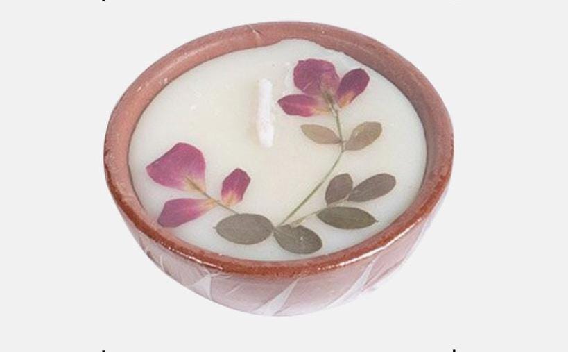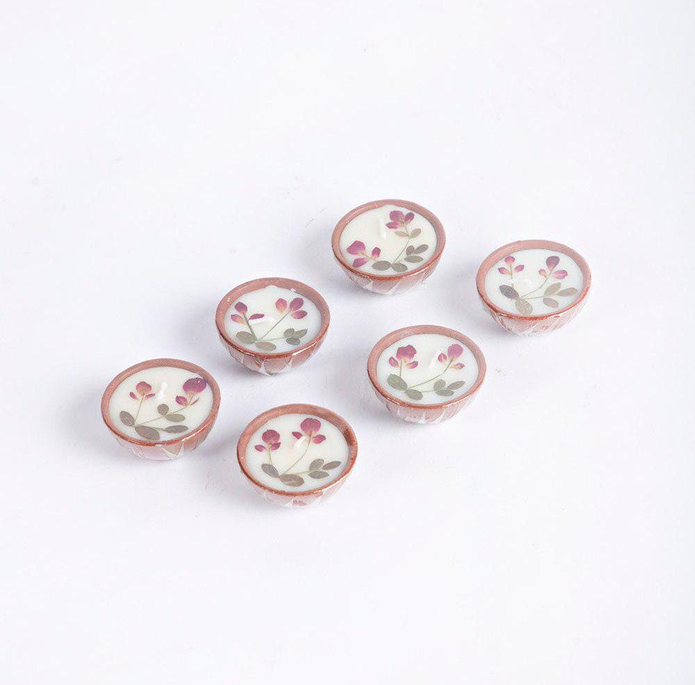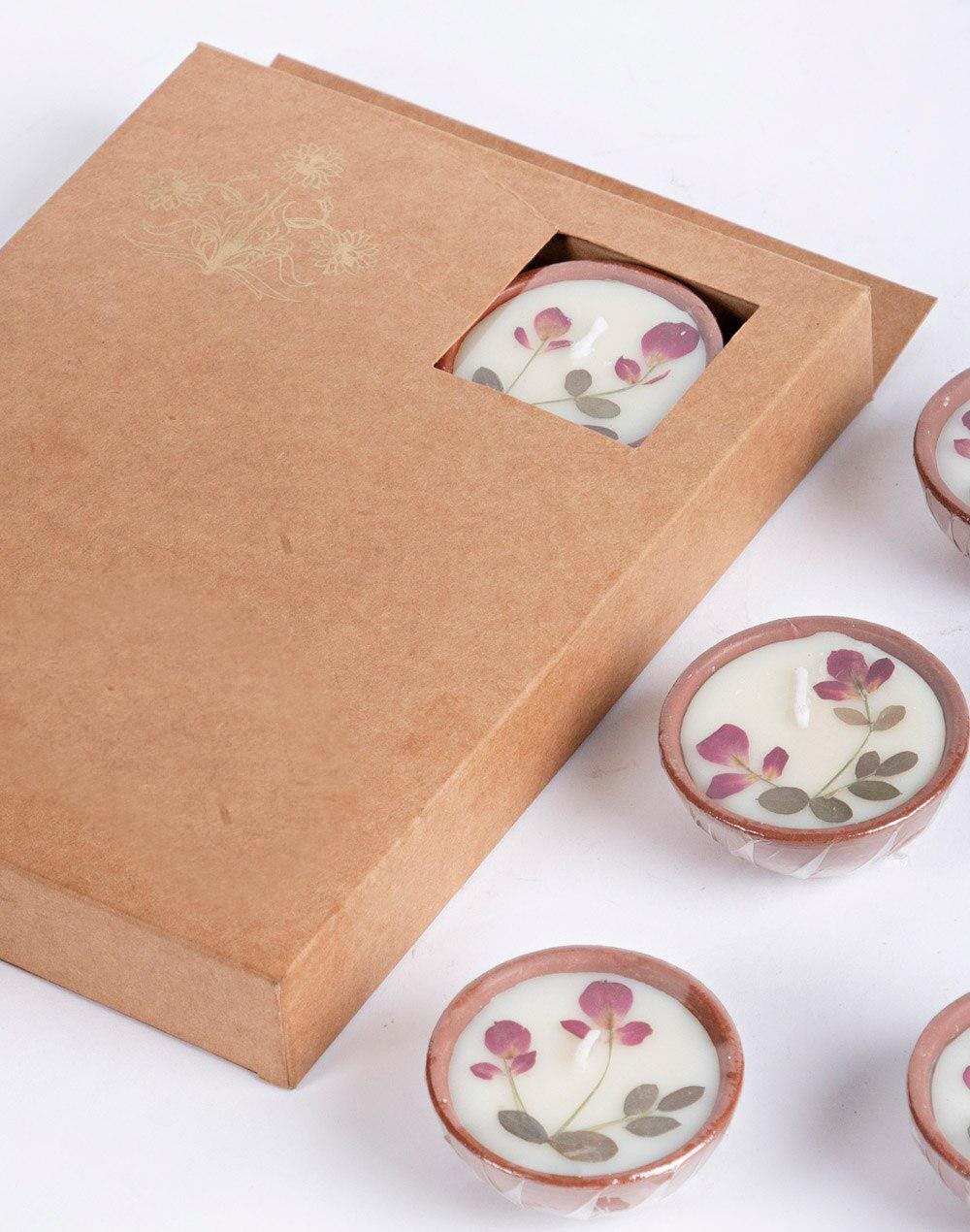 A set of six handmade soy wax candles poured into rustic terracotta pots, each adorned with real pressed flowers for a natural, artisanal touch. These small floral candles create a warm, inviting ambiance, perfect for home décor, gifting, or special occasions. The combination of earthy terracotta and delicate botanicals makes them a beautiful addition to any space. Comes in a beautiful box