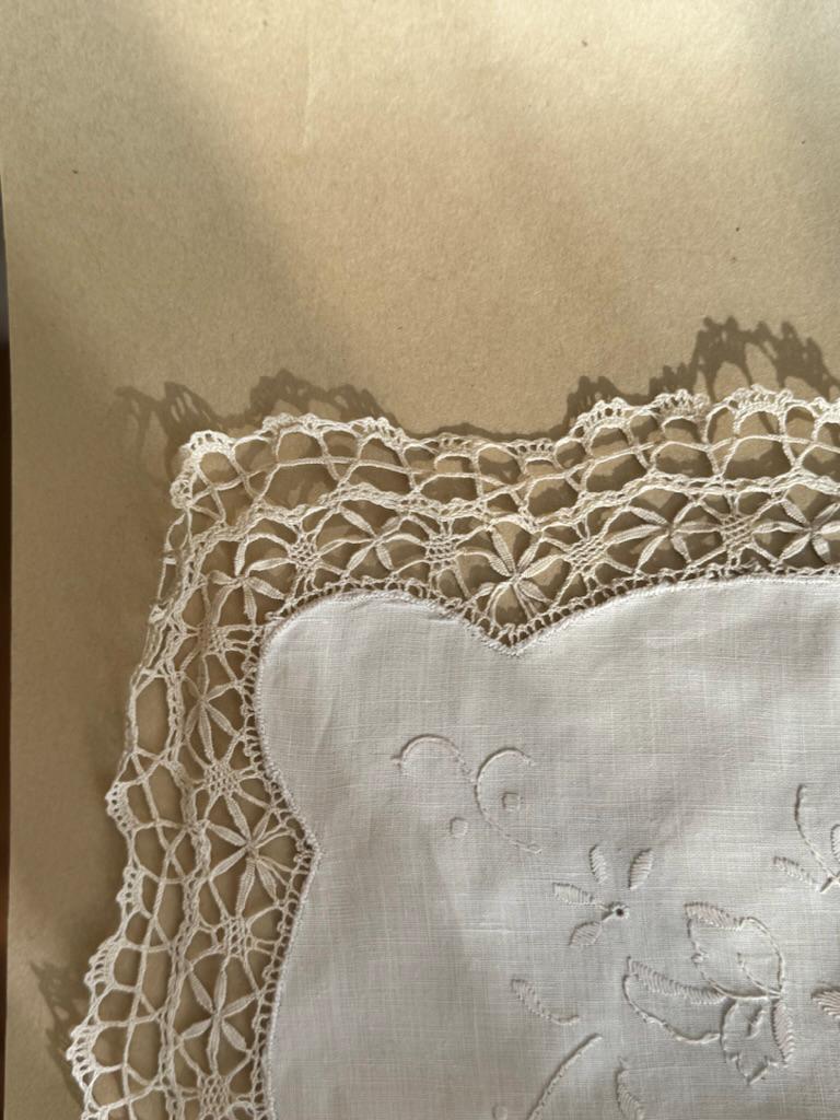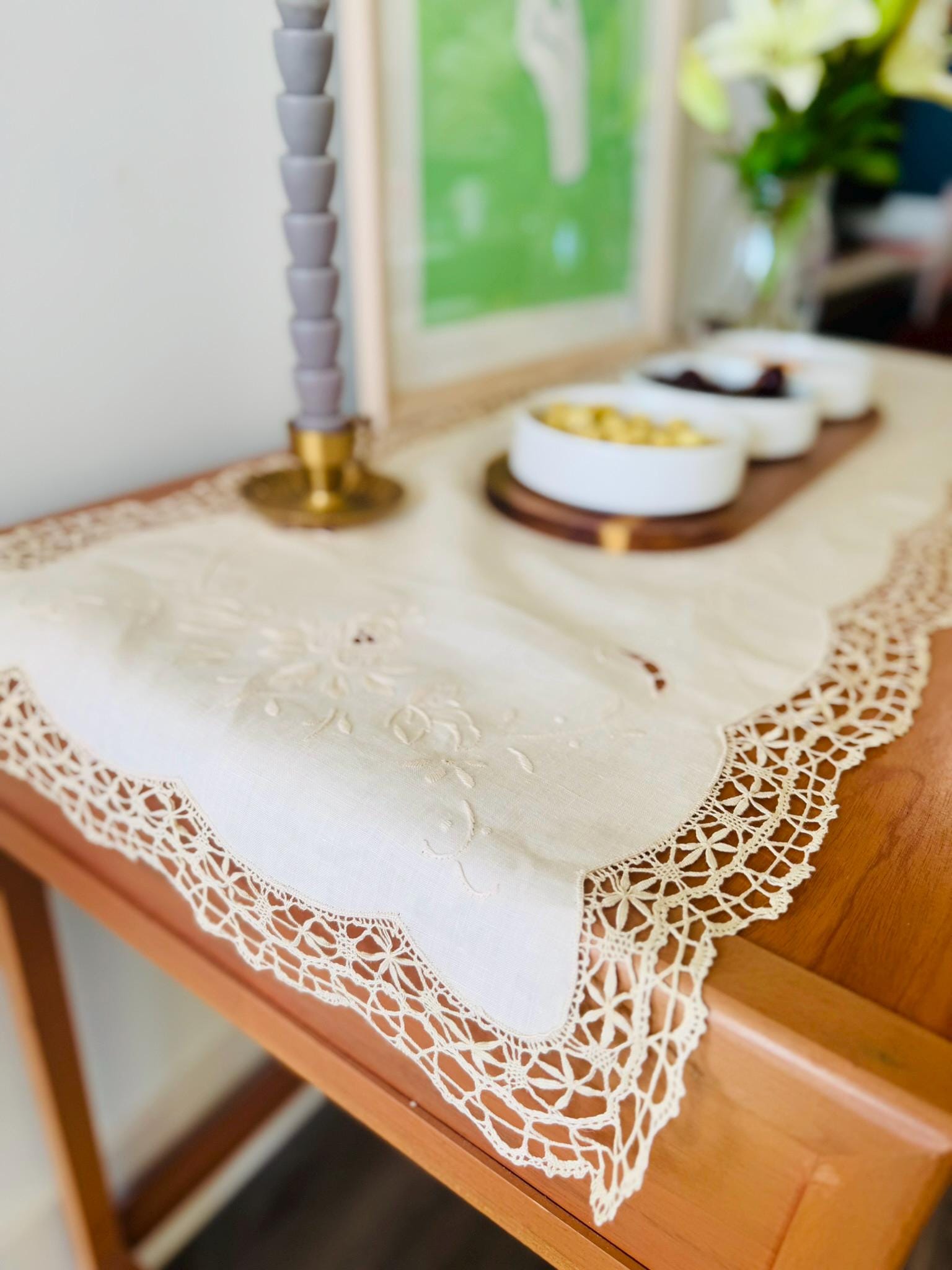 Vintage linen table runner with Belgian lace trim and floral embroidery. The soft ivory fabric and delicate lace edging add a simple, classic touch to a dining table, console, or dresser. Lightweight and easy to style, this piece works well in cottage, farmhouse, or traditional interiors.