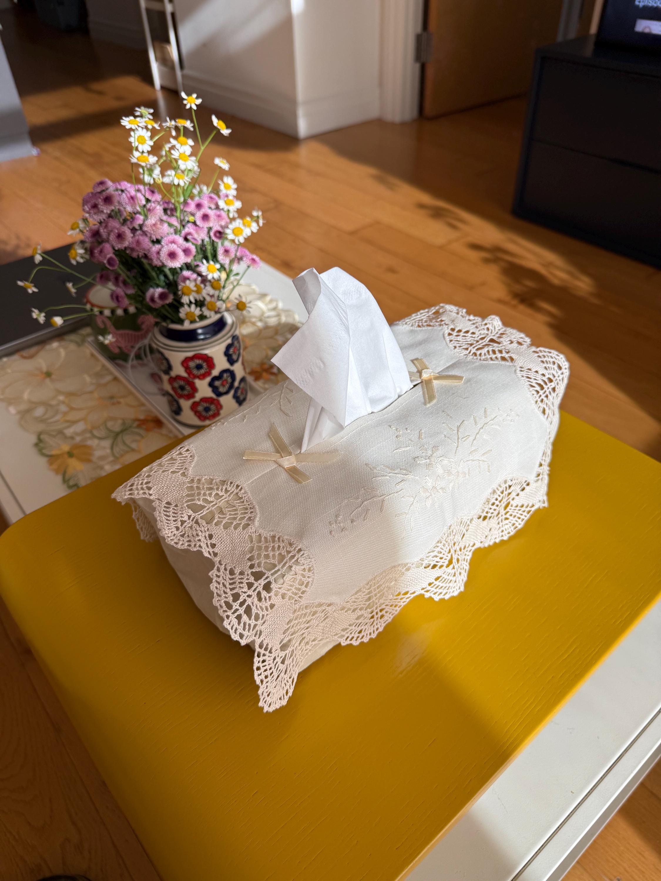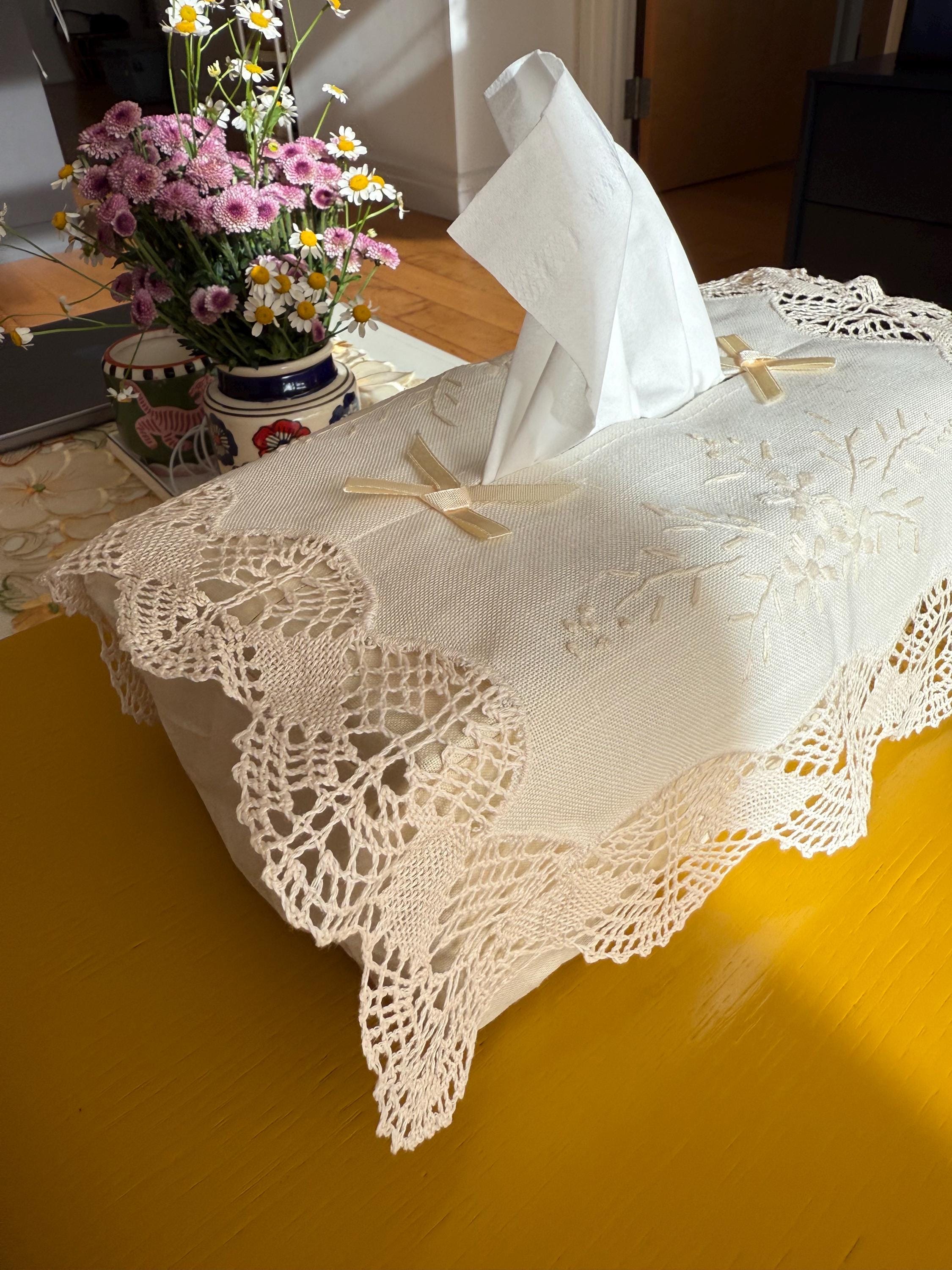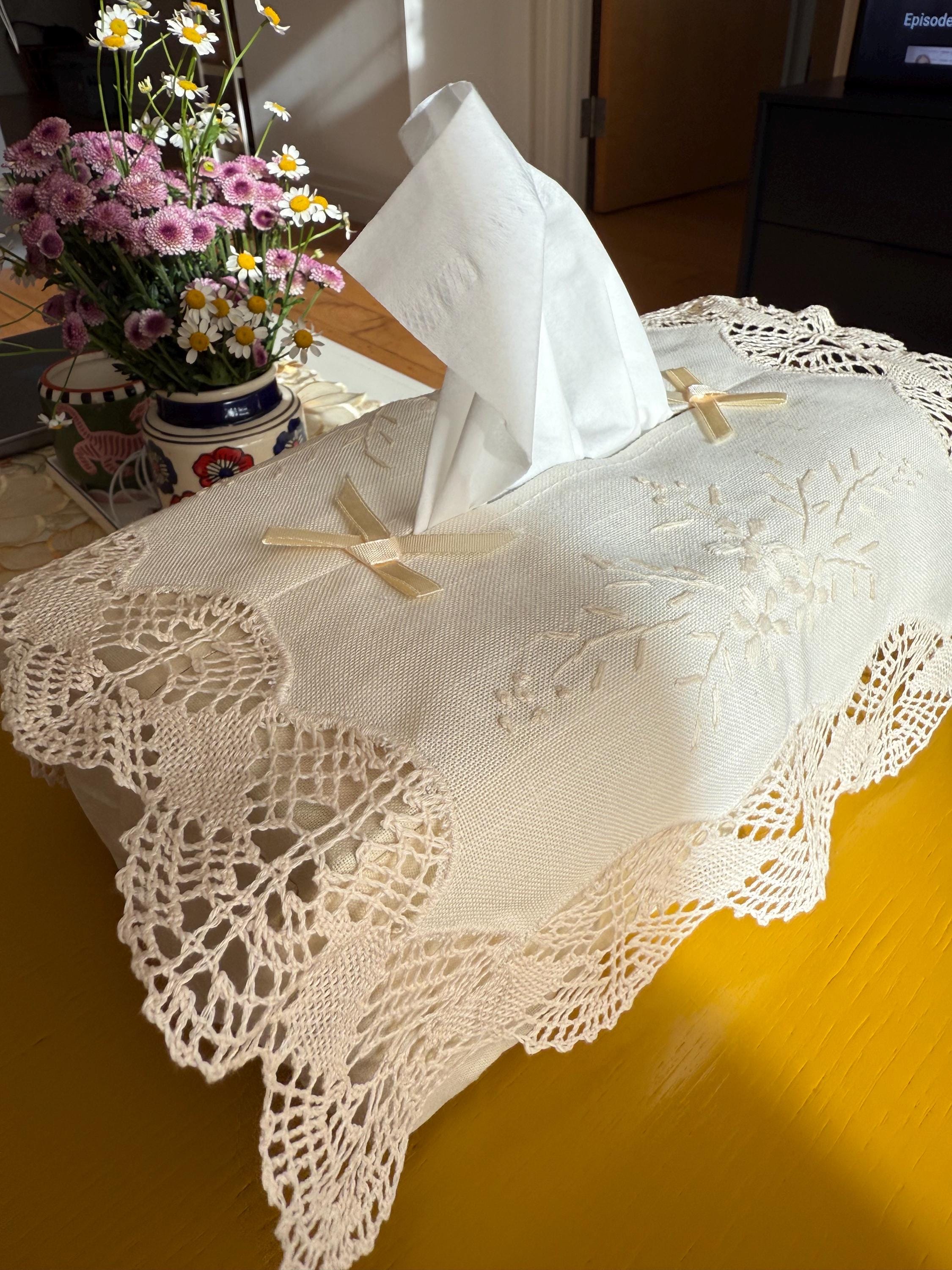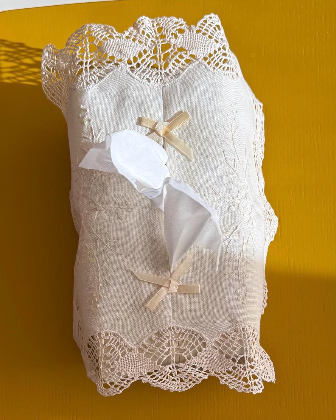 This vintage linen tissue box cover features hand-embroidered flowers and a battenberg lace border. Inspired by French country décor, it was curated from our visit to Bruges and carries a touch of old-world charm.