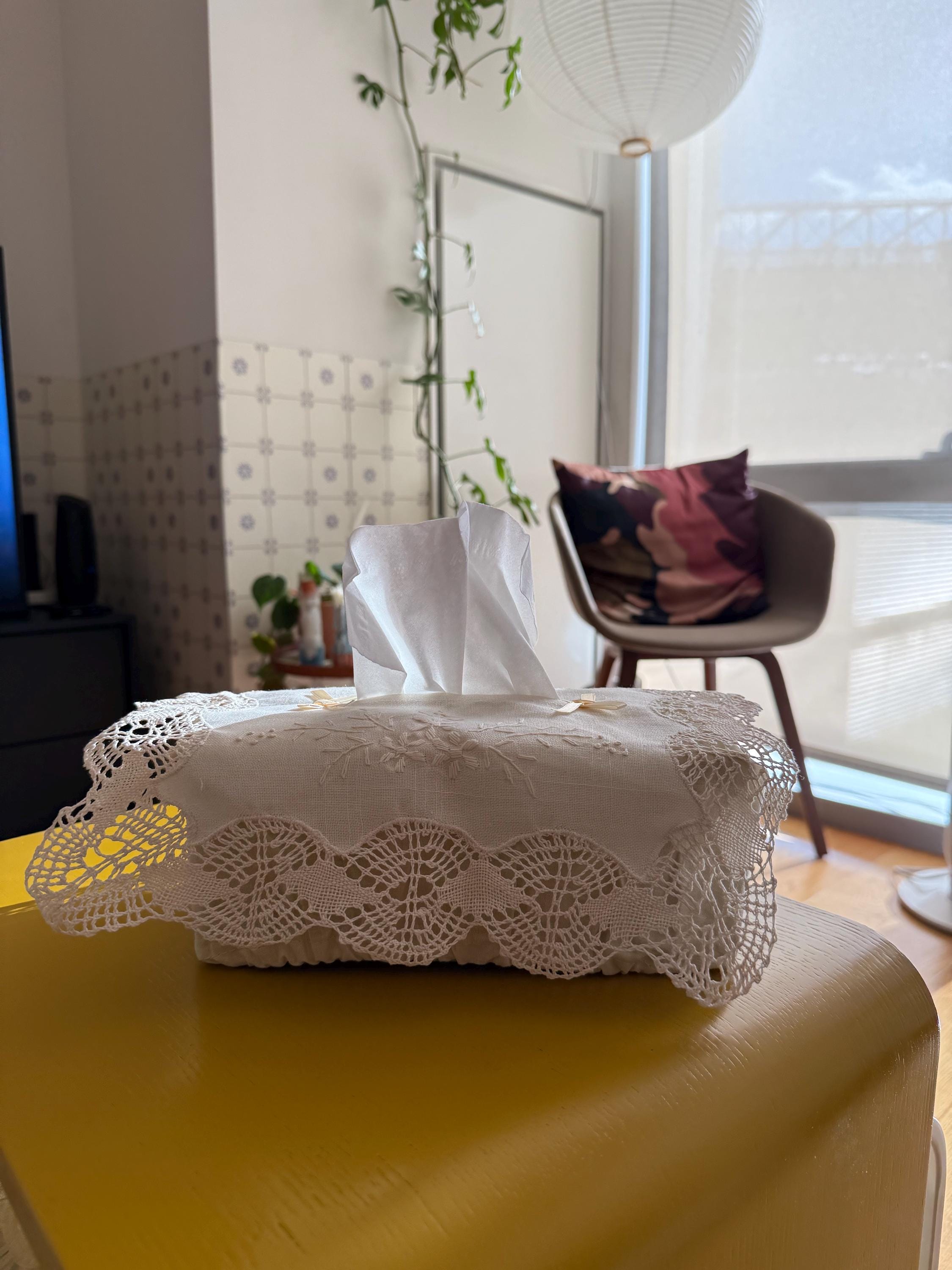 Suitable for bathrooms, bedrooms, and living spaces, this fabric cover combines European craftsmanship with a soft, understated design. It is designed to fit standard rectangular tissue boxes and includes side ties for a secure fit.