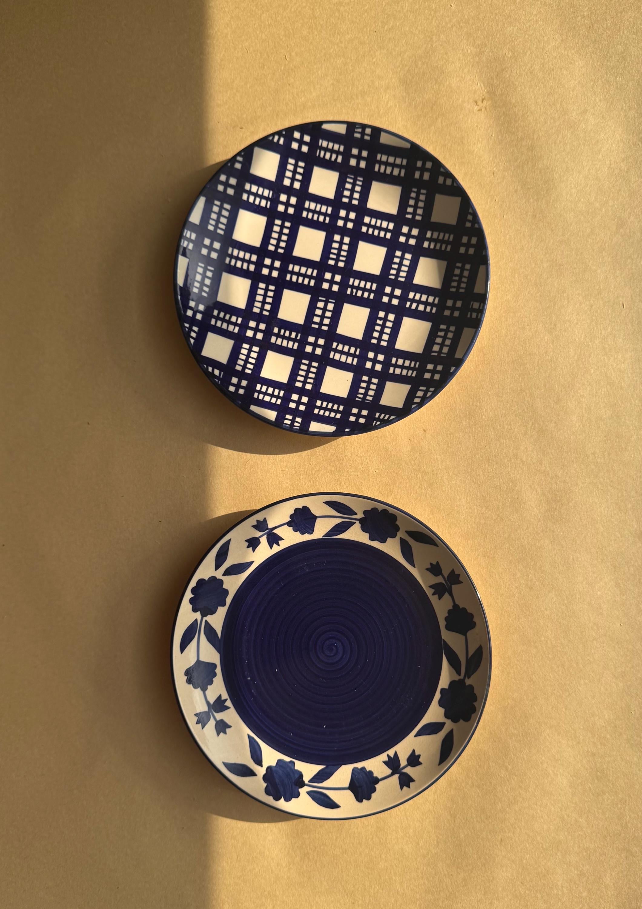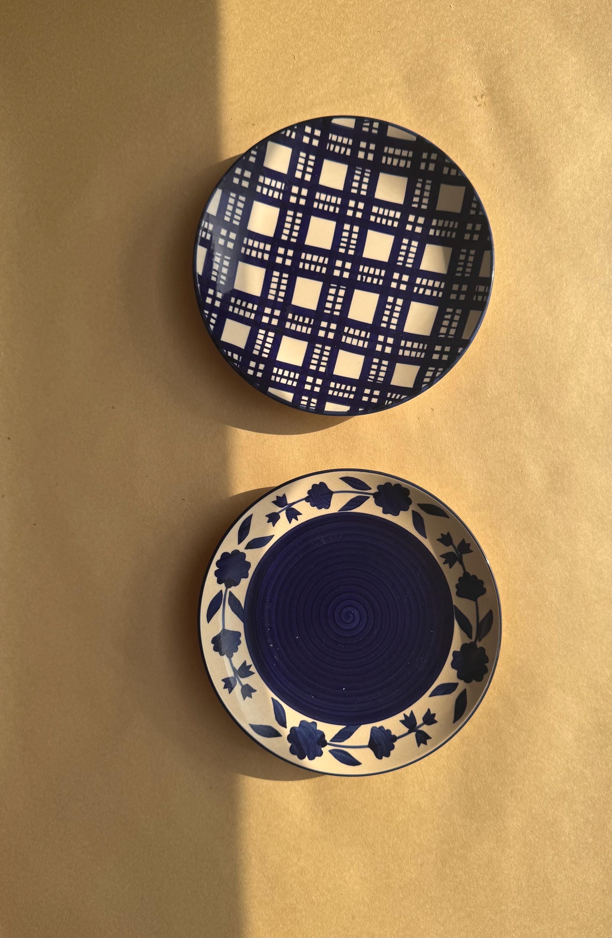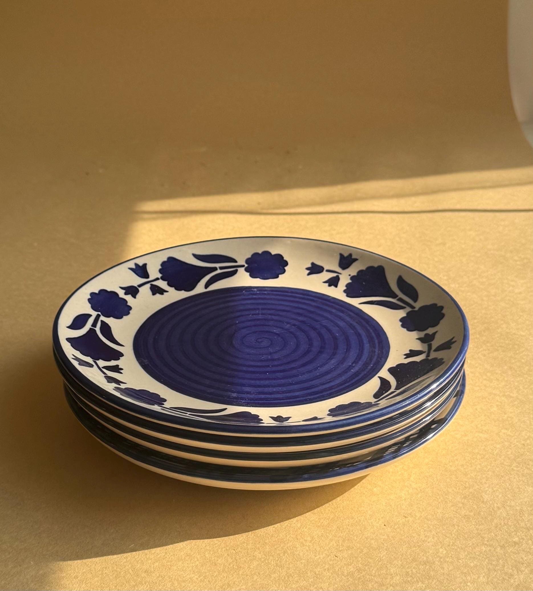 Elevate your table with this hand-painted floral ceramic plate, a timeless blend of artisan charm and modern simplicity. With a bold indigo spiral center and a delicate floral rim, this piece is perfect as a dessert plate, appetizer dish, or even as decorative wall art.