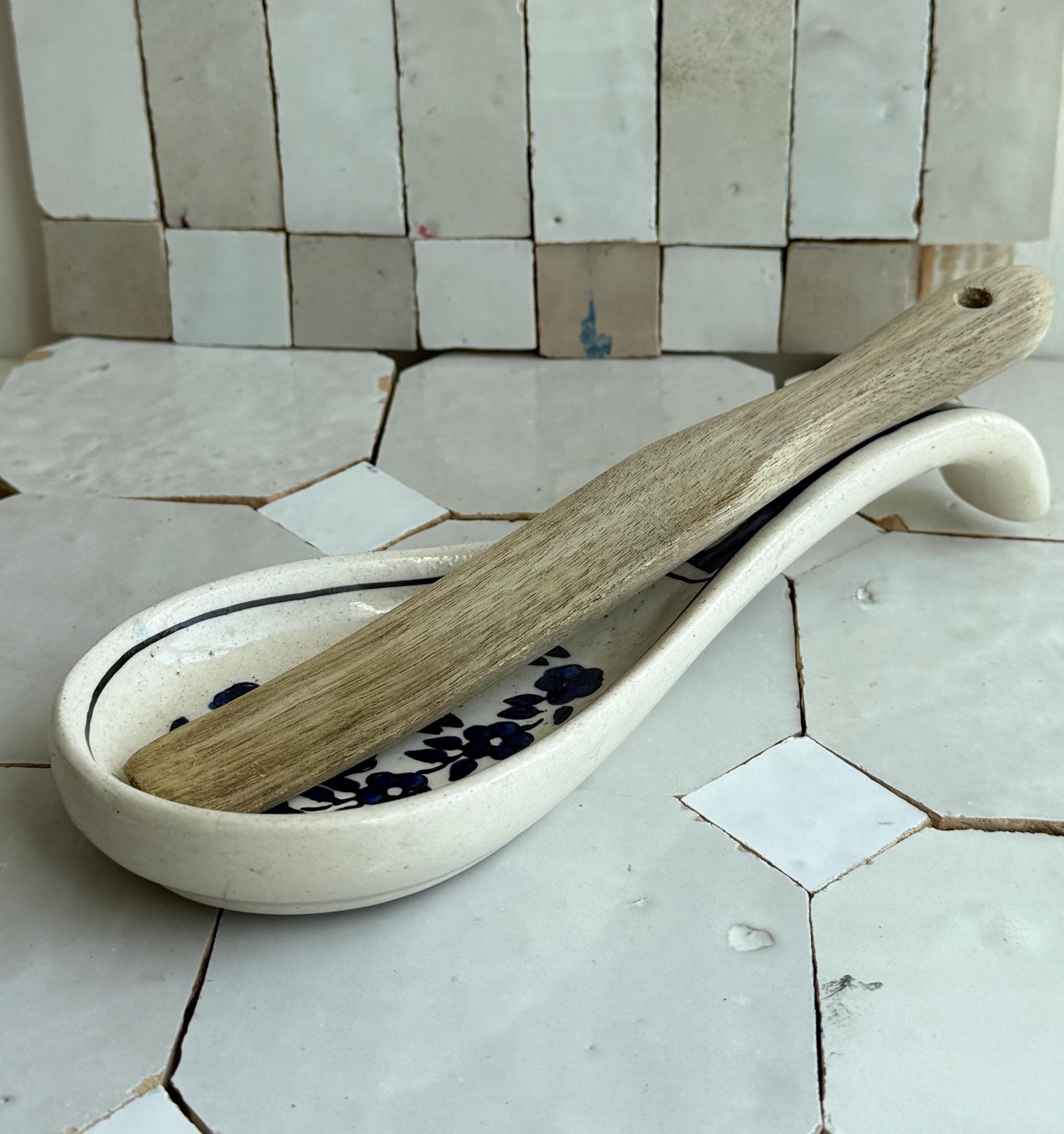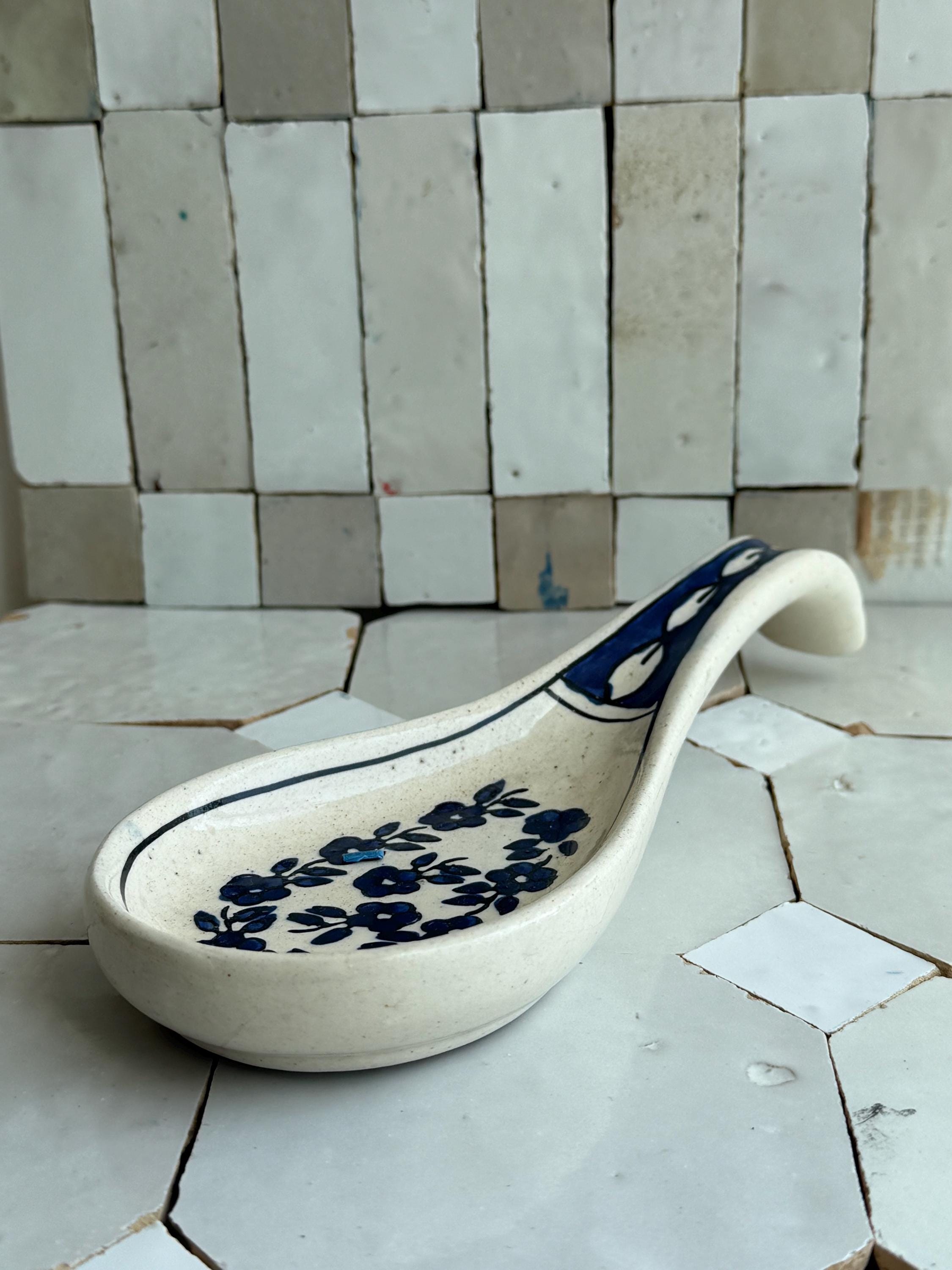 A handcrafted ceramic spoon rest featuring a striking cobalt blue accent. Perfect for keeping countertops clean in style, this piece blends everyday function with artisanal charm.9" long 4" wide 1" high