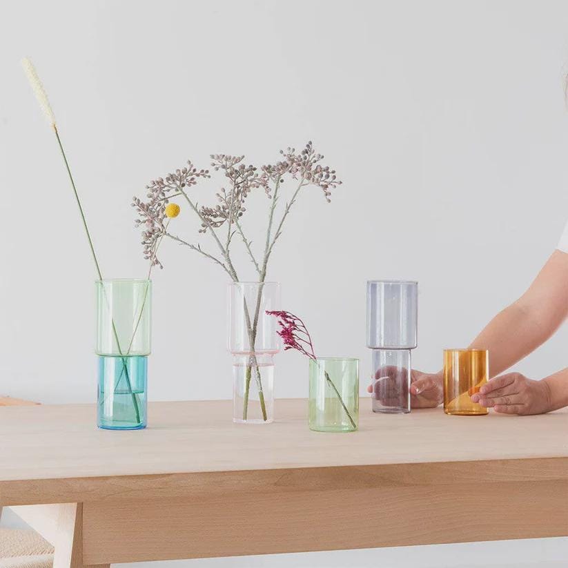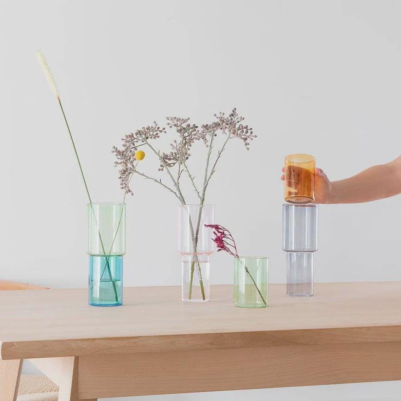 A two-in-one borosilicate glass vase designed for versatility. Flip to use as a bud vase or a wider flower holder.Dia 3 x 9 inches high