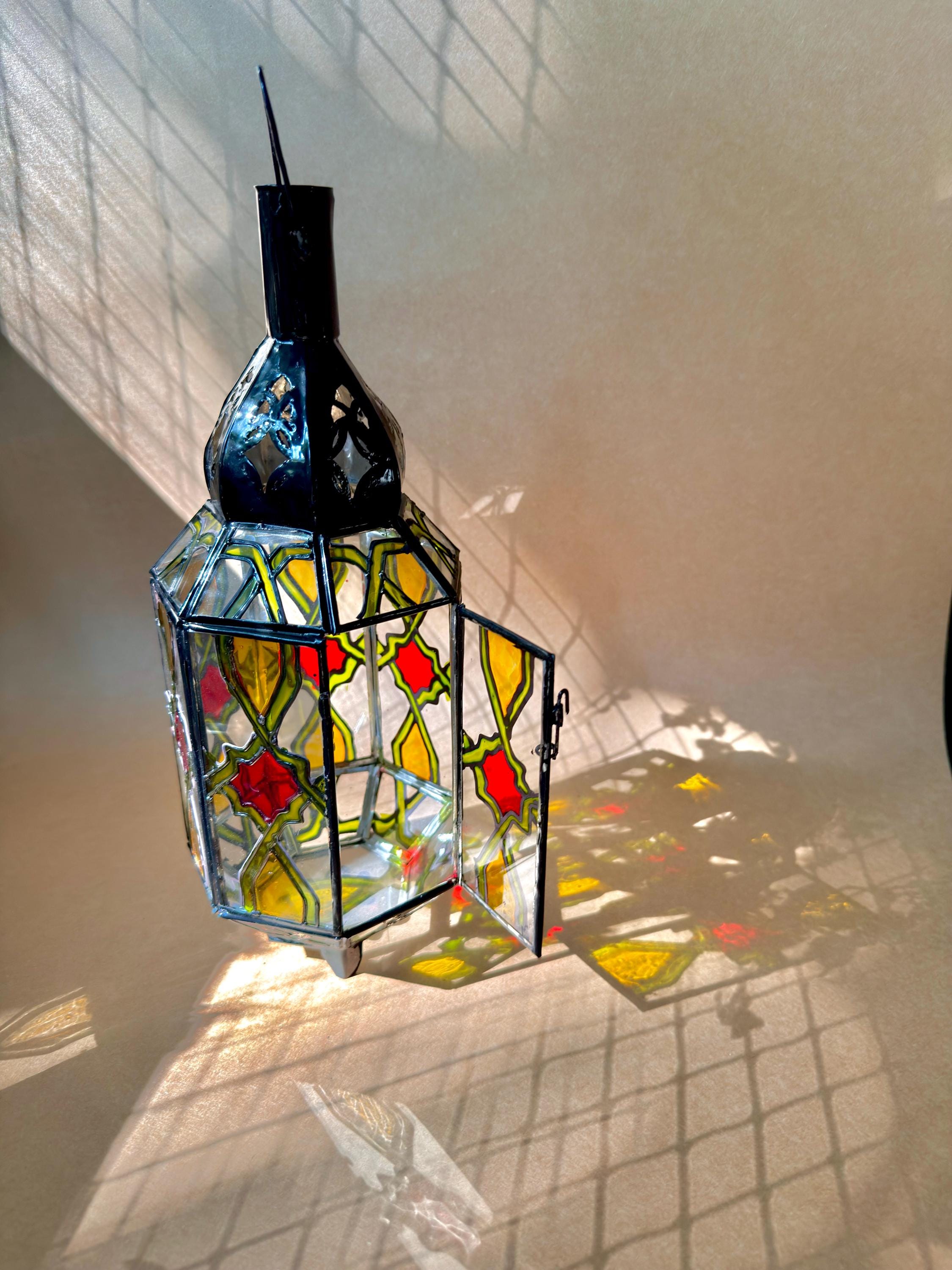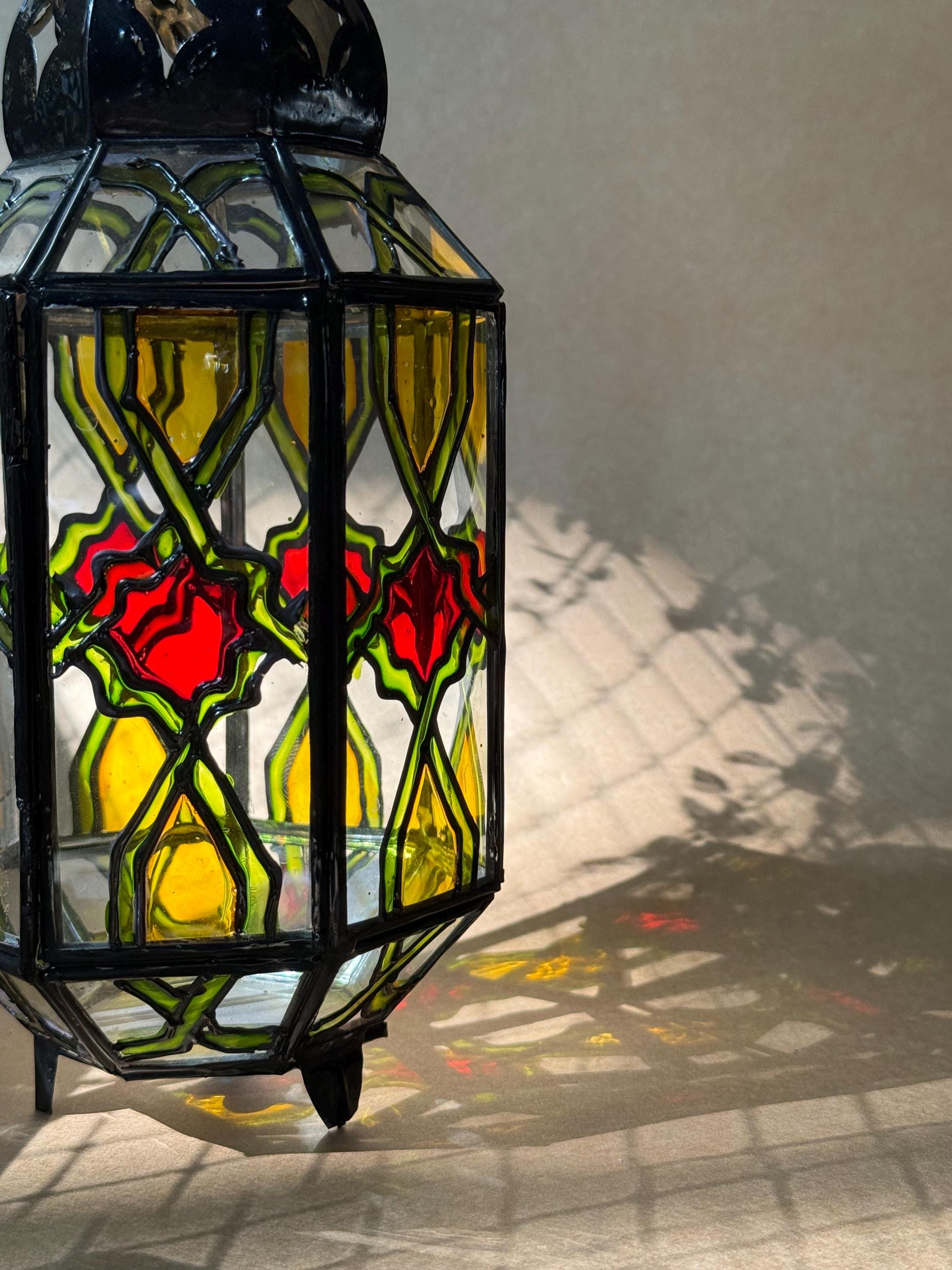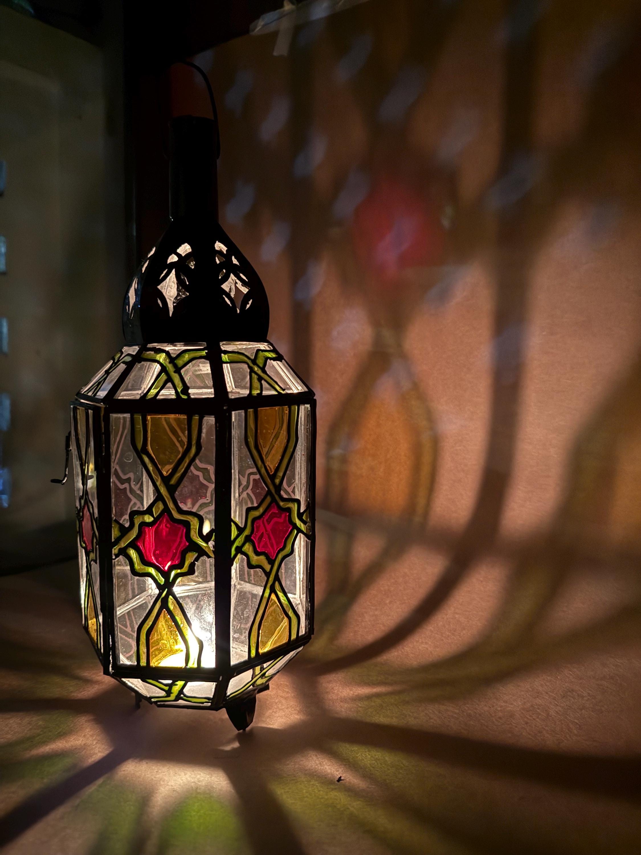 This handcrafted lantern brings a warm, subtle glow to any room.Details:Material: Stained glass and metalDimensions: 6" high 3.5" wideUse: For tea lights, LED candles, or decorative purposesCare Instructions: Wipe clean with a soft cloth