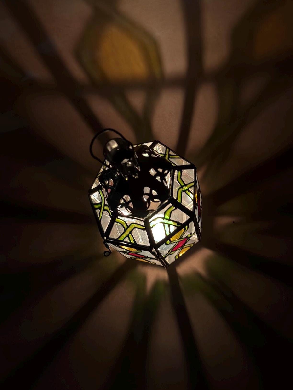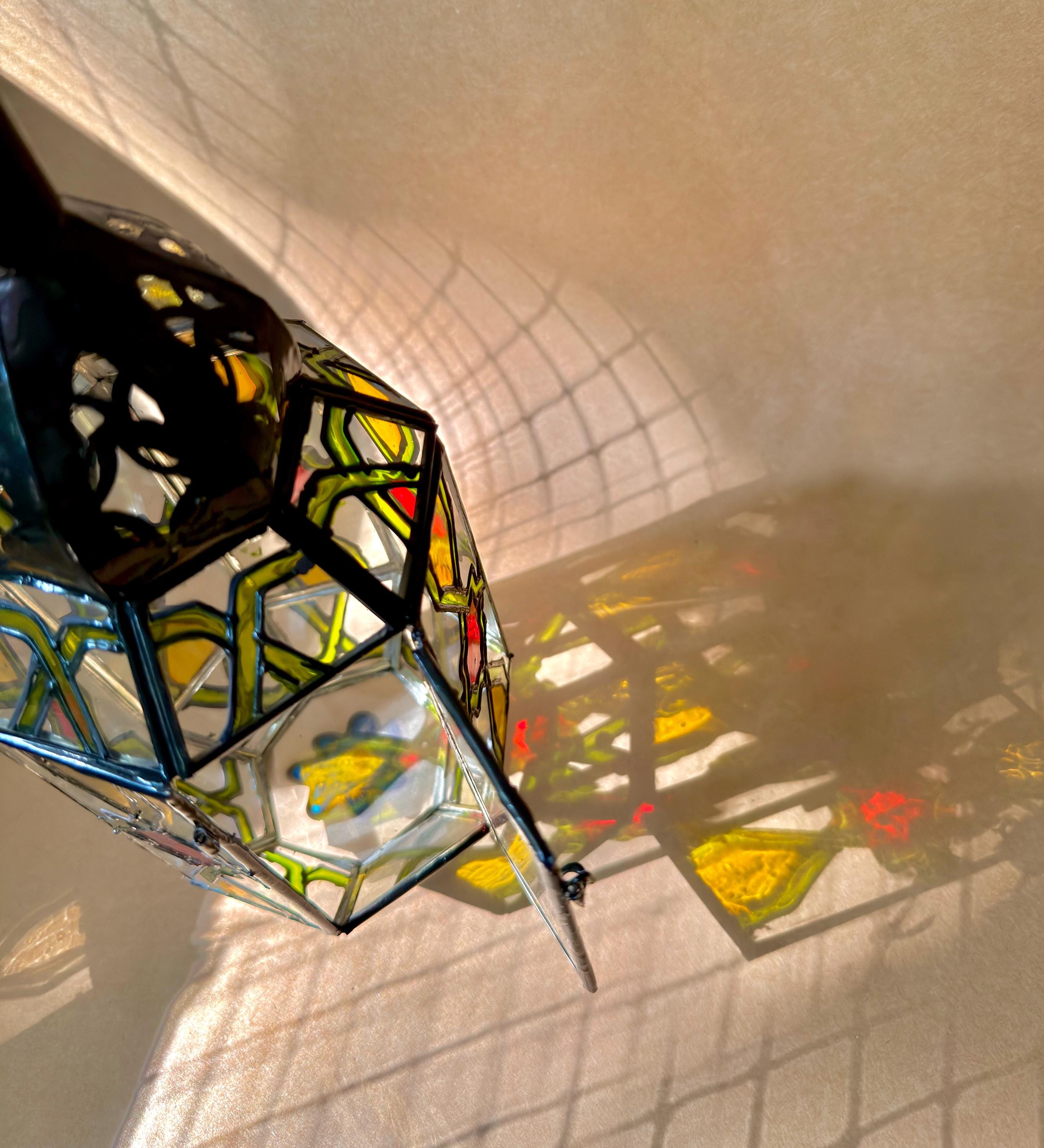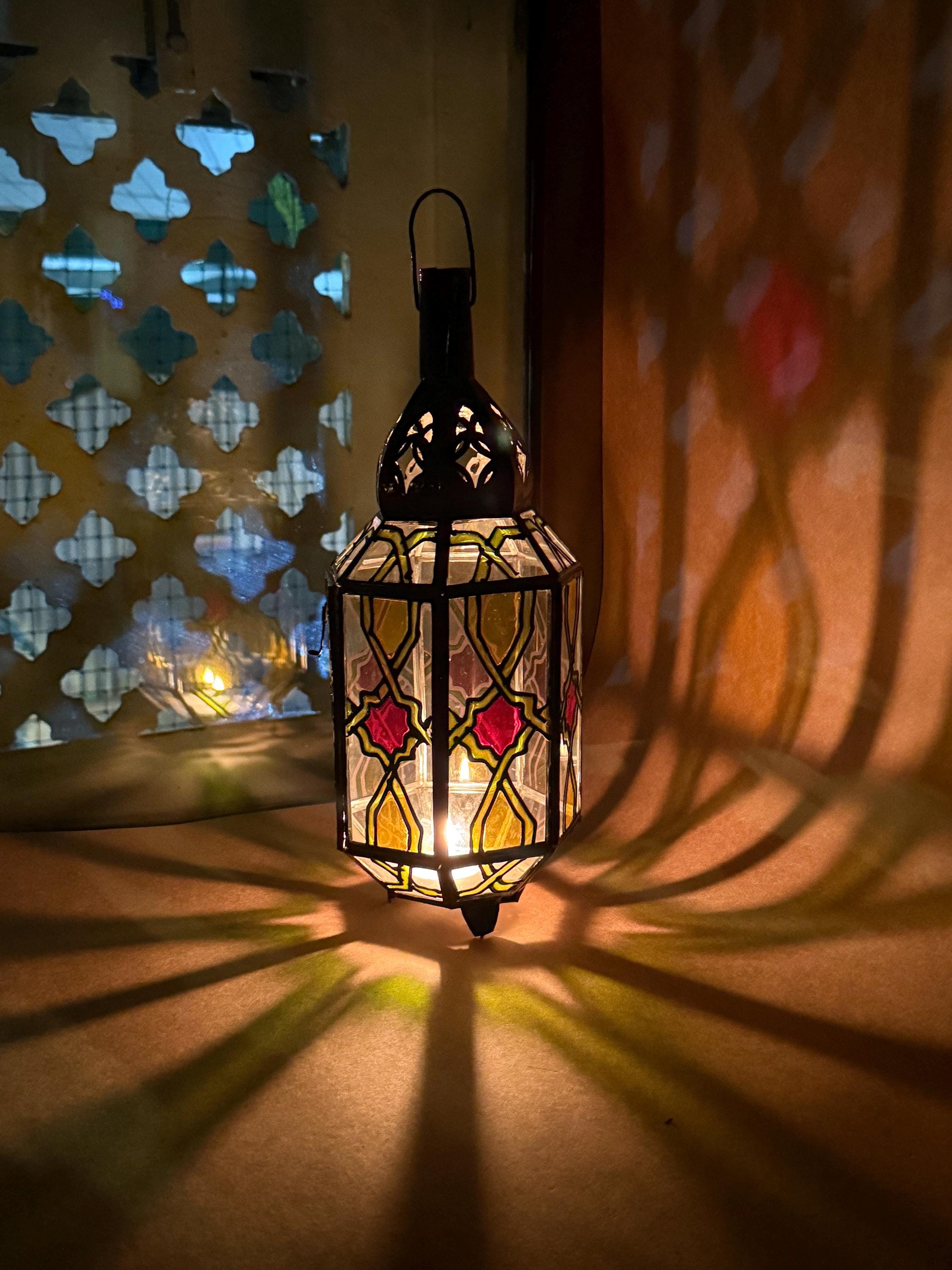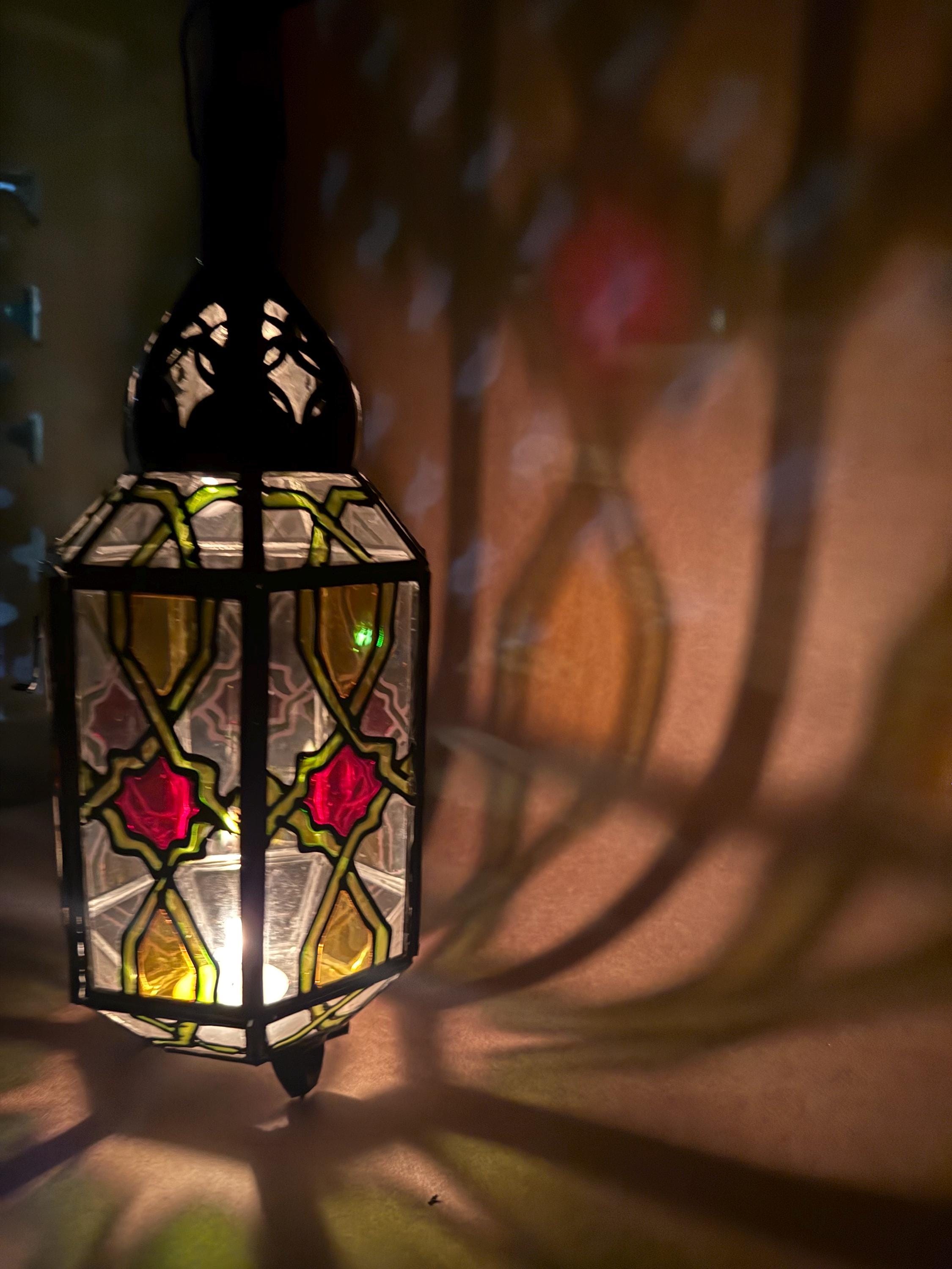 This handcrafted lantern brings a warm, subtle glow to any room.Details:Material: Stained glass and metalDimensions: 6" high 3.5" wideUse: For tea lights, LED candles, or decorative purposesCare Instructions: Wipe clean with a soft cloth