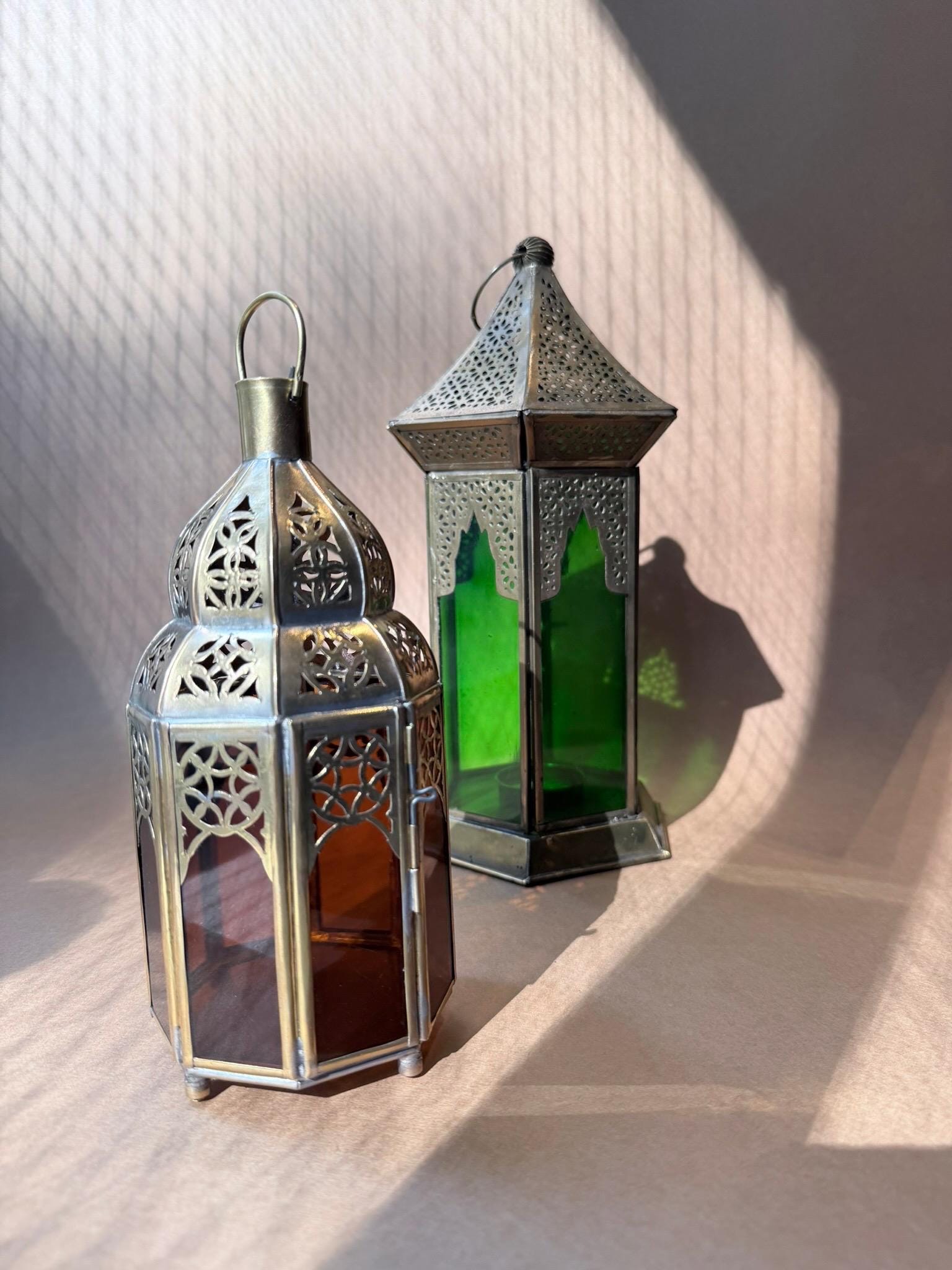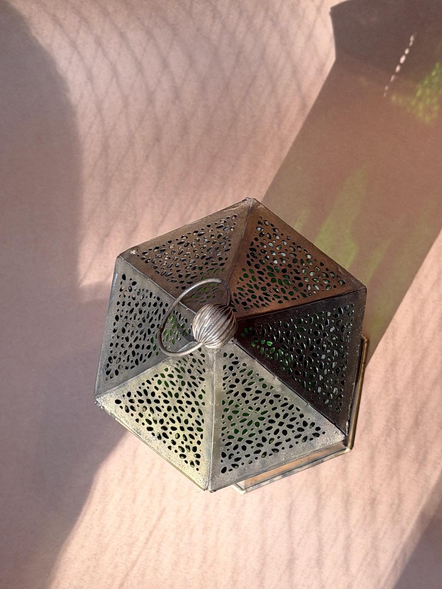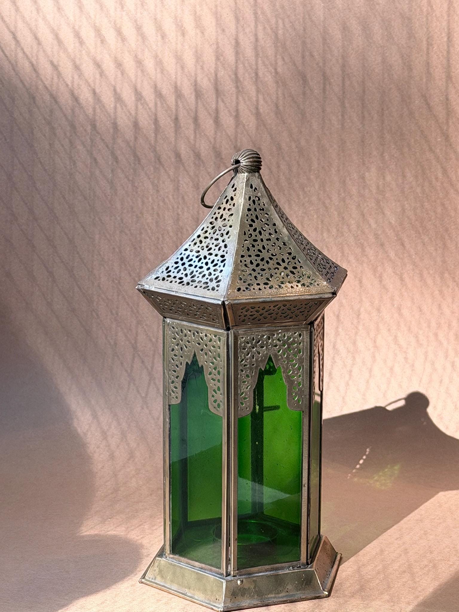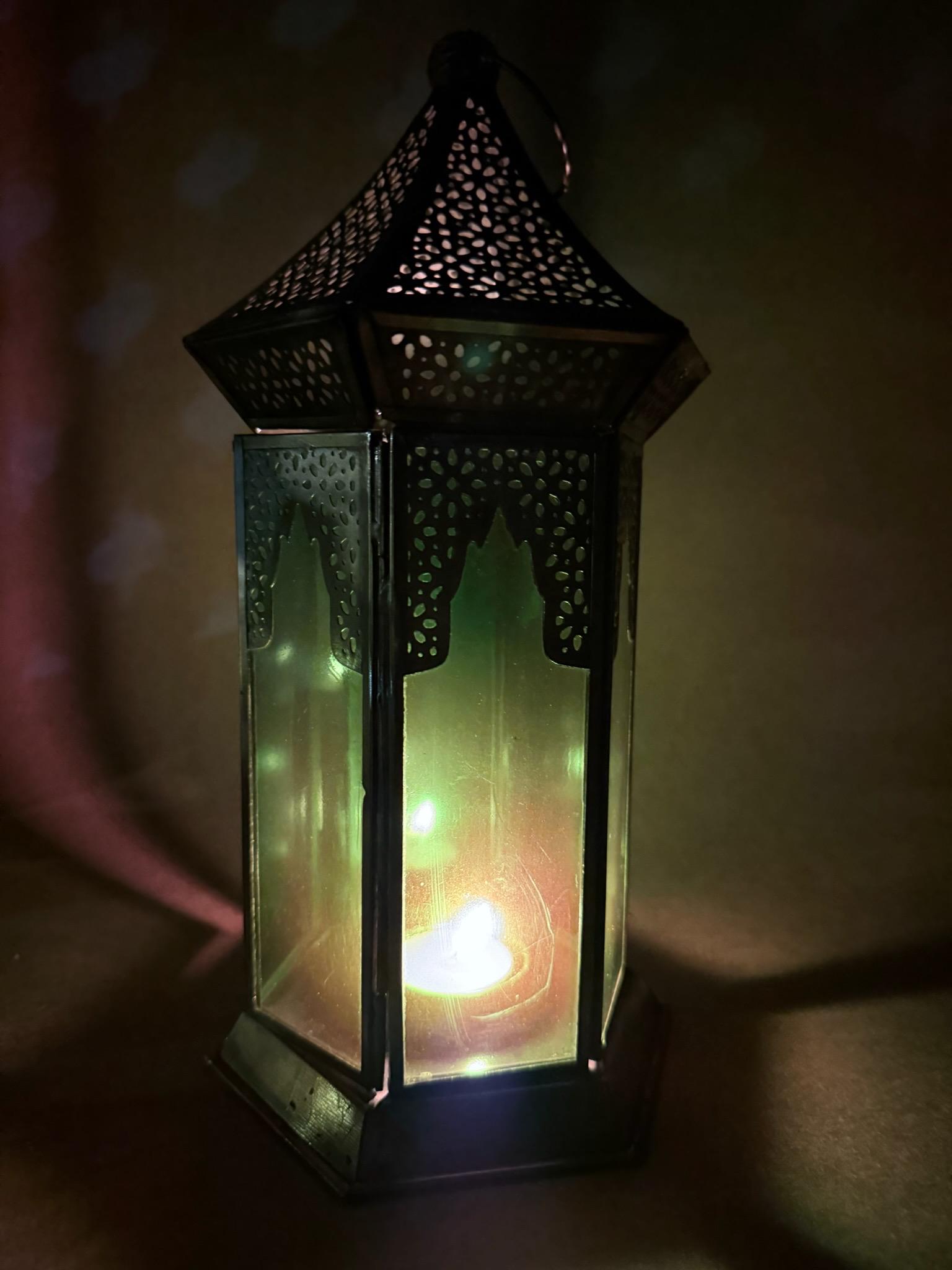 Material: Stained glass and metalDimensions: 6" high 3.5" wideUse: For tea lights, LED candles, or decorative purposesCare Instructions: Wipe clean with a soft cloth